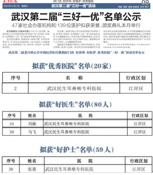 为深入贯彻落实党的二十大精神,贯彻国家关于社会办医的指导方针,推动武汉市社会办医高质量发展,武汉市非公立医疗机构协会、长江日报社举办了武汉第二届老百姓心目中的民营医疗机构“三好一优”活动。活动旨在表彰在医疗服务、技术水平、患者口碑等方面表现突出的民营医疗机构,为广大市民提供更优质、更可靠的医疗服务。在本次评选中,武汉民生耳鼻喉专科医院凭借其雄厚的技术实力、优质的医疗服务和良好的社会声誉,荣获“优秀医院”荣誉称号,彰显了其在耳鼻喉头颈外科领域的专业地位和品牌影响力。